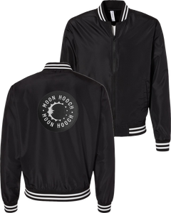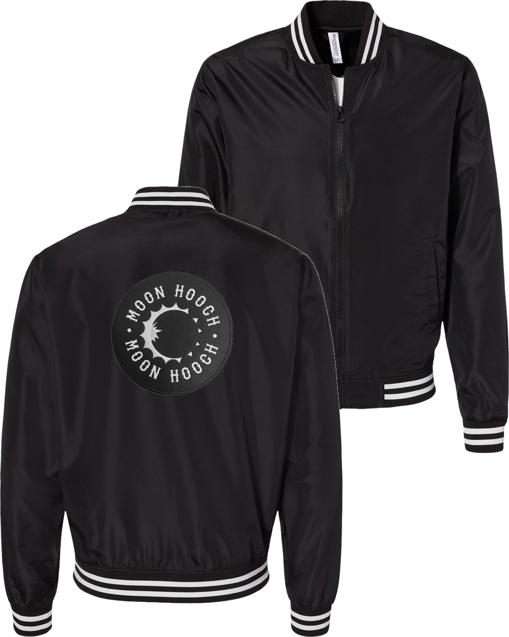 Lightweight bomber jacket with 9" woven patch sewn on the back.